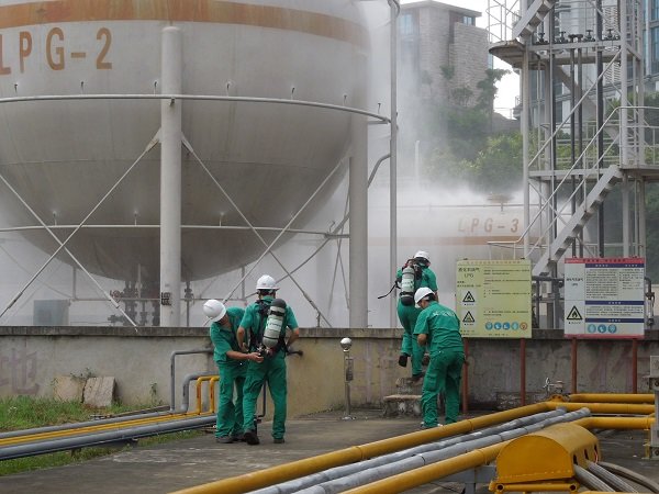 2014年6月18日下午15:30,曠遠能源股份有限公司在生產(chǎn)部氣源廠開展關(guān)于LPG儲罐法蘭泄漏應(yīng)急處理演練。